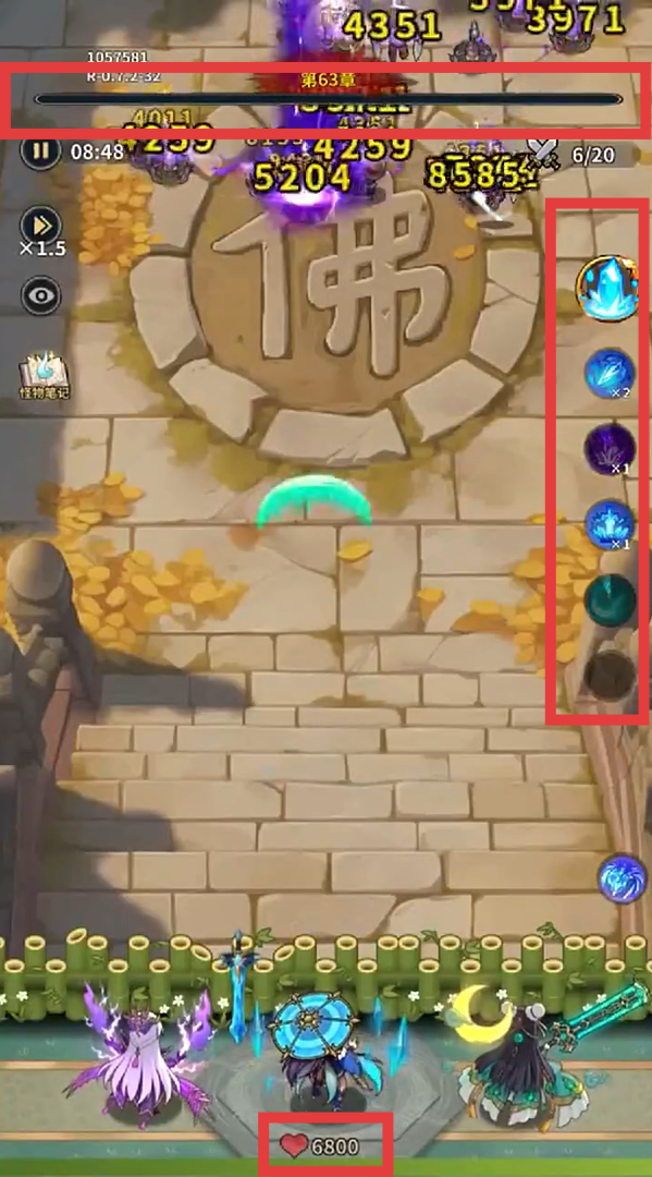 2、战斗中,留意红框内的关卡进度条、怪物血量数值及我方角色生命值,合理利用右侧红框内的技能图标,击败怪物推进关卡。