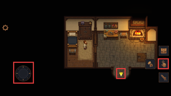 2、使用左下角红框内的圆形控制键移动角色,通过右下角红框内的功能键(如手形图标等)与场景互动,推进游戏进程。