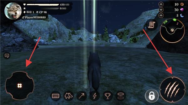 2、游戏中,左摇杆控制移动,右【爪子】按钮释放技能,熟悉操作后探索场景(如黑夜山林)。
