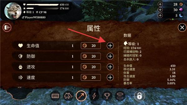 2、角色成长路线:通过战斗和捕猎提升属性,解锁特殊技能,培养独一无二的狼王。