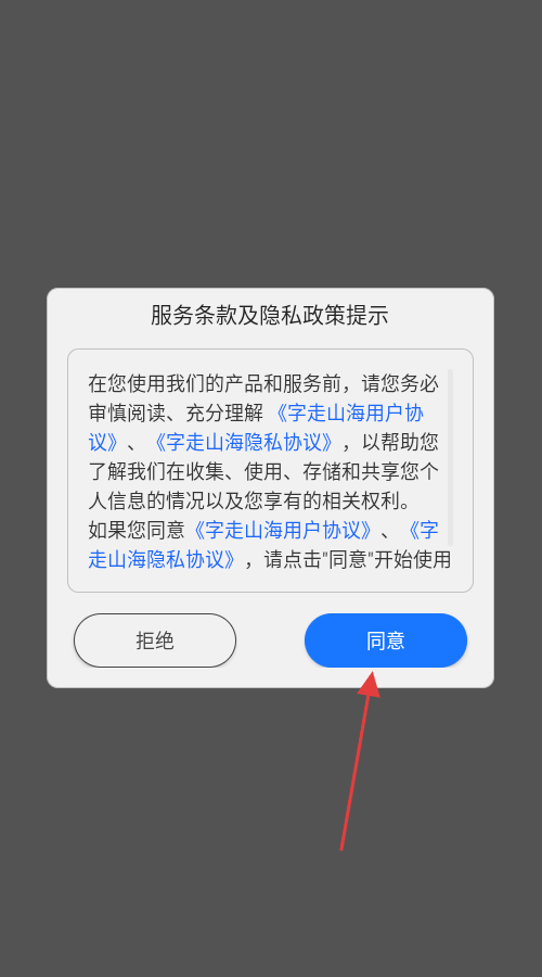 1、在服务条款及隐私政策提示界面,点击【同意】,进入《字走山海》游戏。