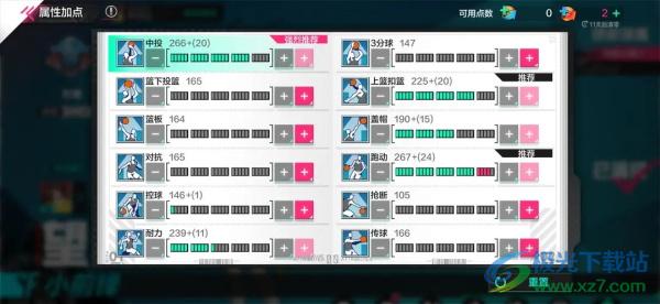1、小前锋在属性加点方面需要拉满跑动和中投,对抗最好上到180。