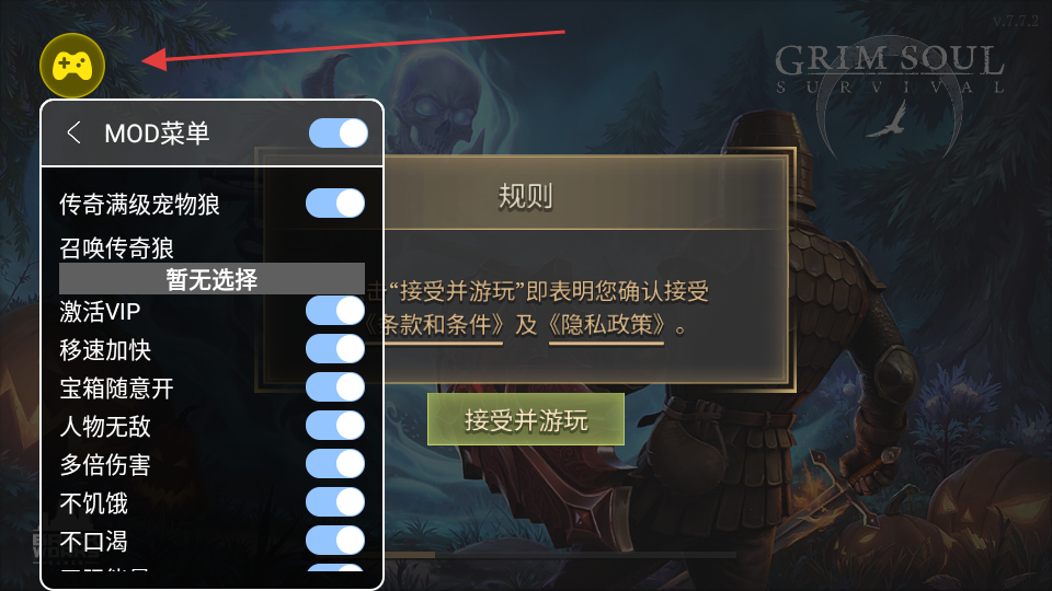 1、点击左上角箭头指的标识,在MOD菜单中,开启“传奇满级宠物狼”“人物无敌”“不饥饿”“不口渴”等功能。