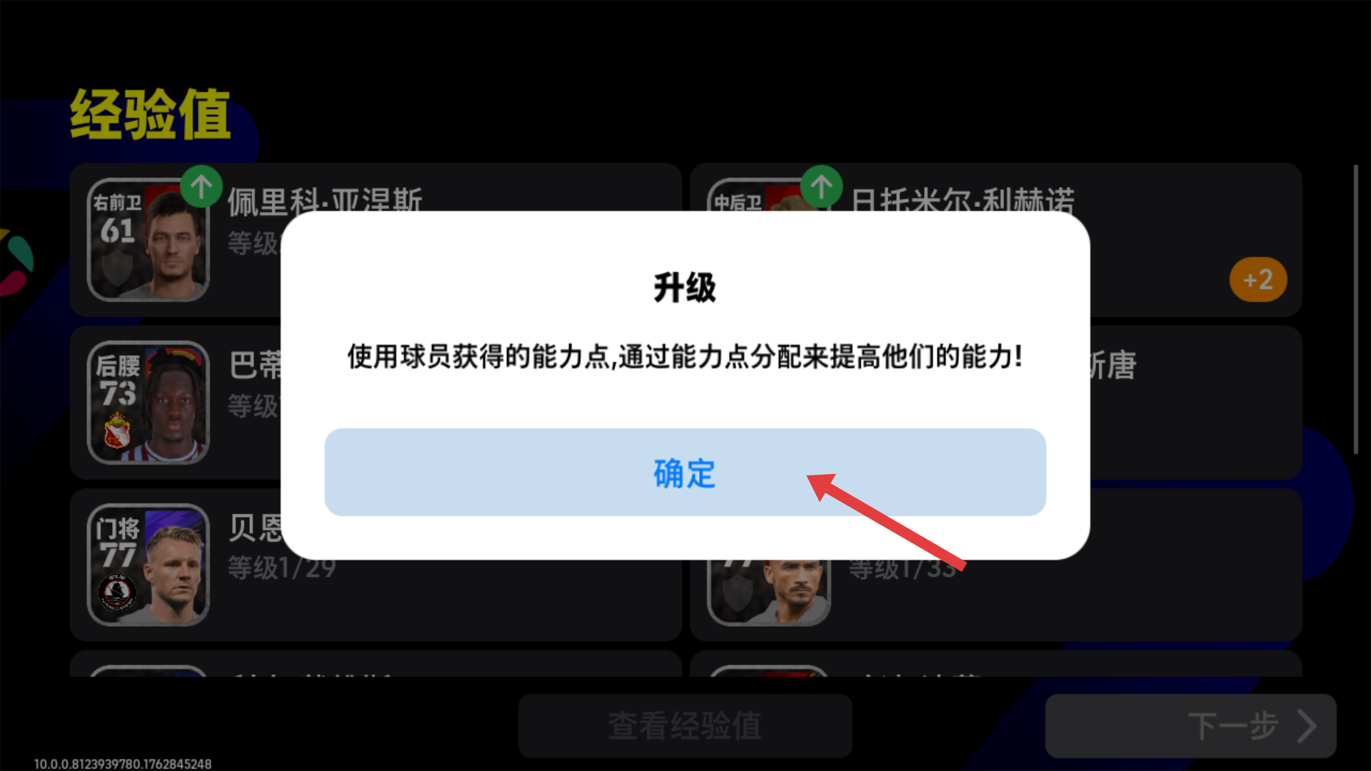 3、比赛结束后球员升级,赶紧点击【确定】,利用能力点提升球员能力,让球队实力更上一层楼呀。