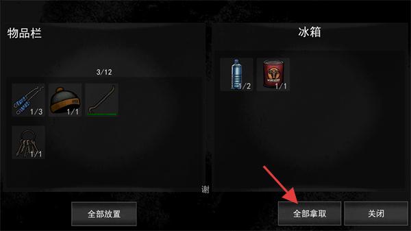 2、点击“全部拿取”按钮,将冰箱内的物资收入物品栏,补充生存所需的资源。