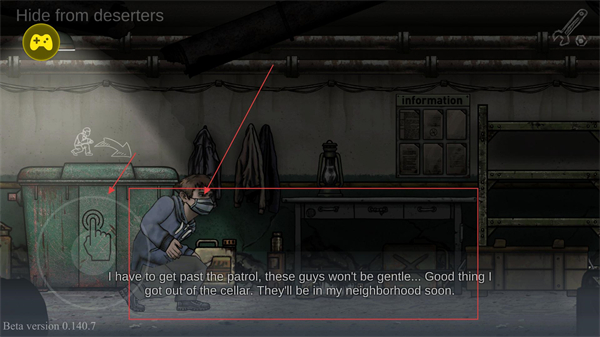3、按照【Hide-from-deserters】提示,蹲伏并利用掩体隐蔽,避开巡逻敌人以安全推进关卡进程。