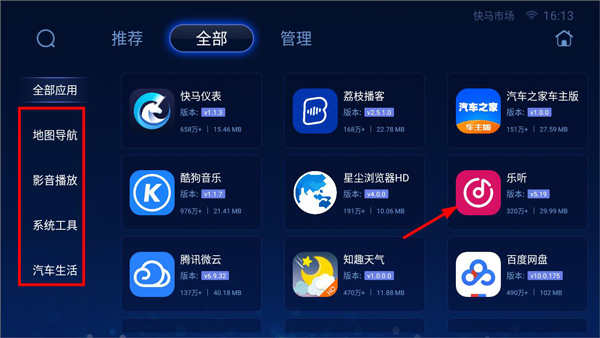 3、用户也可以打开全部应用页面,根据应用分类查找(地图导航、影音播放、系统工具、汽车生活等);