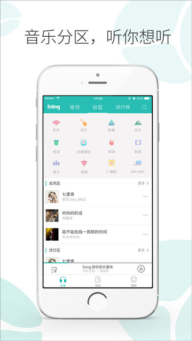 5sing原创音乐这款软件是一款中国原创音乐的平台,平台拥有小曲儿、回音哥、河图等上万位知名音乐人入驻,是广大原创音乐作者的在线交流平台。用户可以在5sing中上传自己创作或是翻唱的歌曲,找到与自己志同道合的音乐伙伴,更好的进行音乐创作。推荐广大从事音乐创作的朋友下载使用哦!