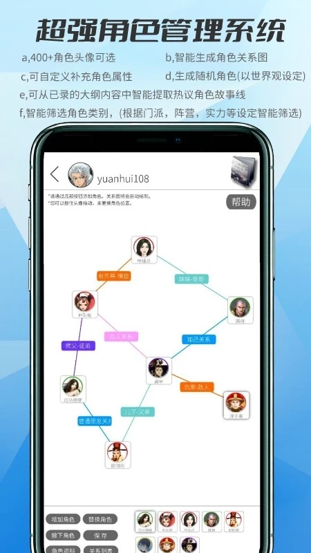 构思工具:提供角色头像,角色属性管理,角色关系图生成,故事线生成,伏笔记录,架空地图生成。