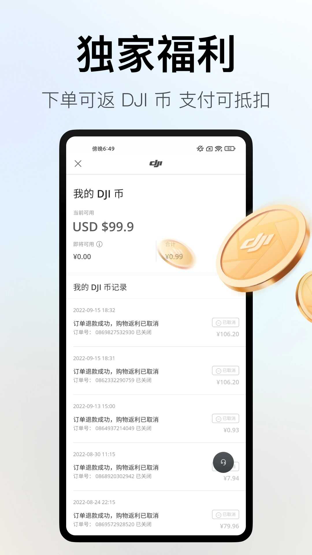1. 返 DJI 币,可用于支付商城内任意订单。