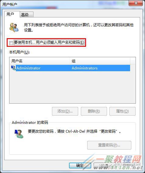 3、在随后打开的用户帐户属性设置窗口中,将“要使用本机,用户必须输入用户名和密码”前的勾选去掉,然后点击“确定”按钮即可,如下图所示: