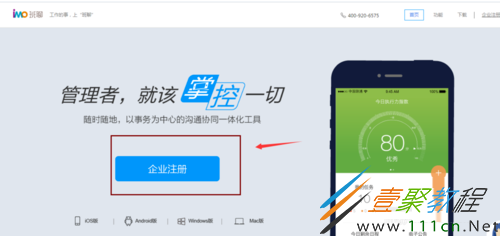 首先百度搜索imo班聊,点击进入imo班聊的官方网站,在页面中点击“企业注册”按钮继续。