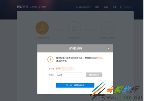 接着输入手机获取到的短信验证码,点击“下一步”按钮继续。