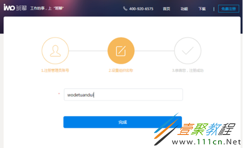 随后会进入创建组织页面, 先输入企业团队的名称,点击“完成”按钮,完成企业注册最后一步。