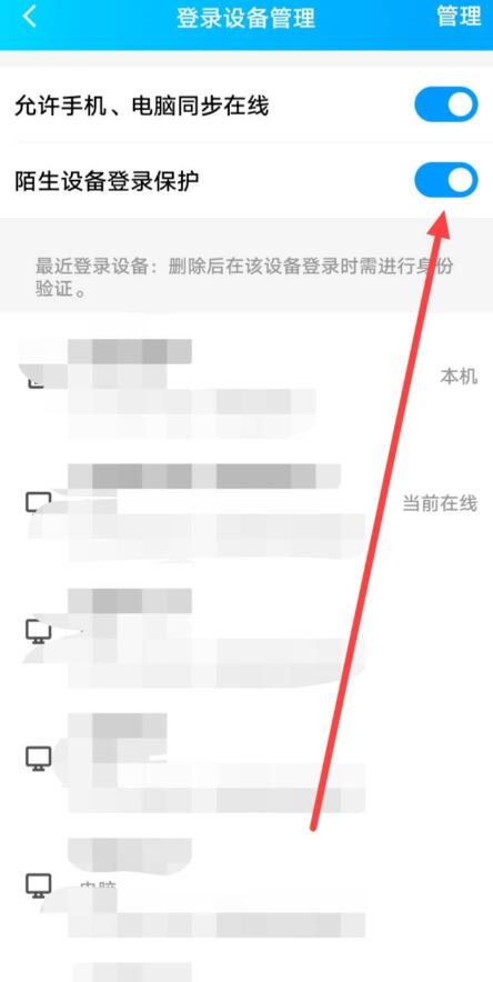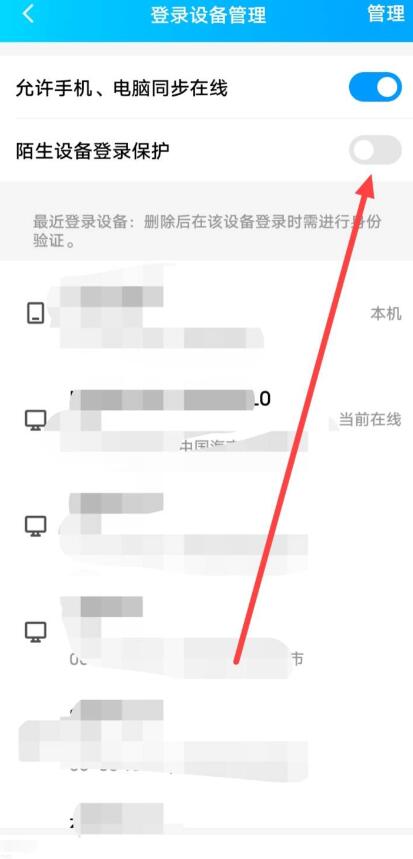 5、然后点击陌生设备登录保护右侧开关按钮。