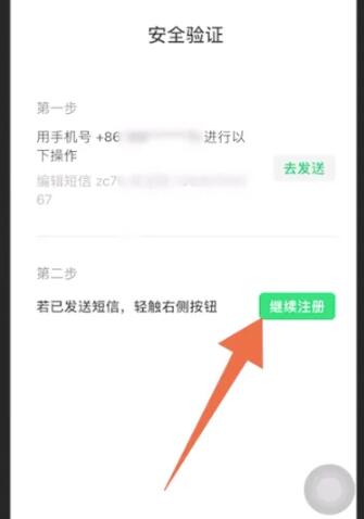 12、在确认短信发送完成之后,来到为微信页面中,点击【继续注册】;