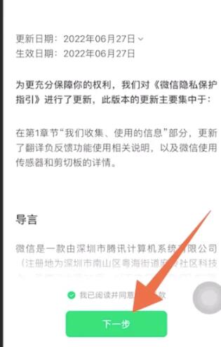 13、进入微信隐私保护指引页面中,勾选【我已阅读并同意上述条款】,点击【下一步】;