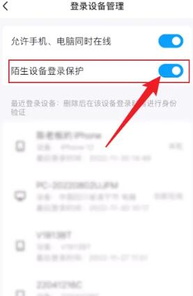 4、然后我们点击陌生设备登录保护右侧的开关按钮。