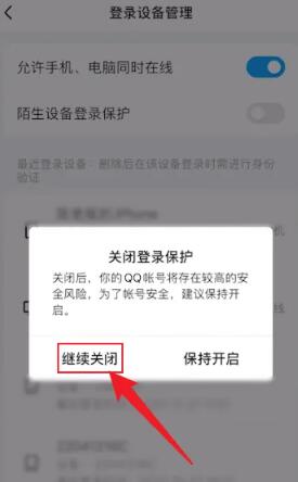 5、最后点击继续关闭即可取消qq新设备登录验证了。