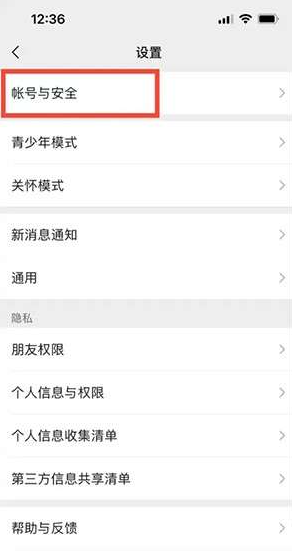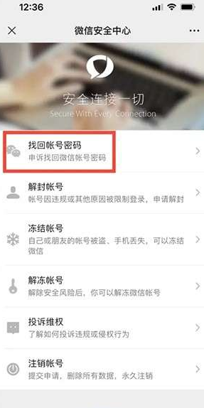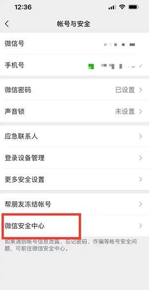 3、我们在账号与安全界面,点击微信安全中心选项。