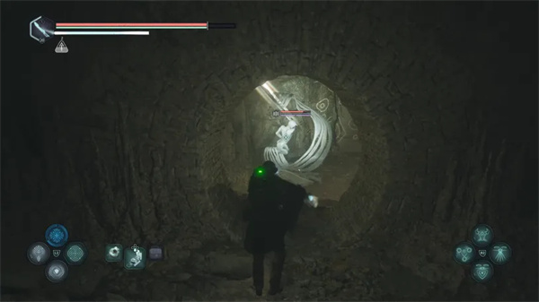 再往寺庙里走,在其中一个分支洞穴中,您会到达一面装饰着洞穴壁画的墙壁。如果你沿着房间里的斜坡向上走,你会在墙上的一个圆形开口中找到一个 Artillery Walker。