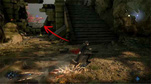 沿着主路走,你会到达一个楼梯,楼梯附近有一堵被毁坏的砖墙。