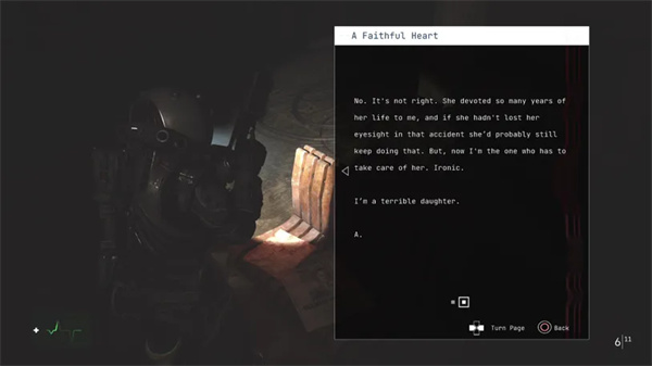 车站漆黑一片,但这不会阻止您探索。在您担心发电机之前,请花点时间检查长凳和周围的行李,以收集一些能量和用品。在其中一张长椅上阅读《忠实的心》,然后进入前面的技术区门。