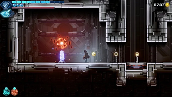 在下一个区域,乘坐电梯平台上去,沿着通道向上走,直到到达带有另一个登机亭的壁架上。激活它即可打开您面前的一扇大门,该门还可以解锁下面的路径。在穿过它之前,请务必沿着右边的小路走,然后返回 Miku Sol(铁匠的角落房间),以节省并充分补充您的生命值。