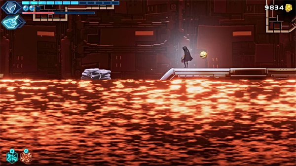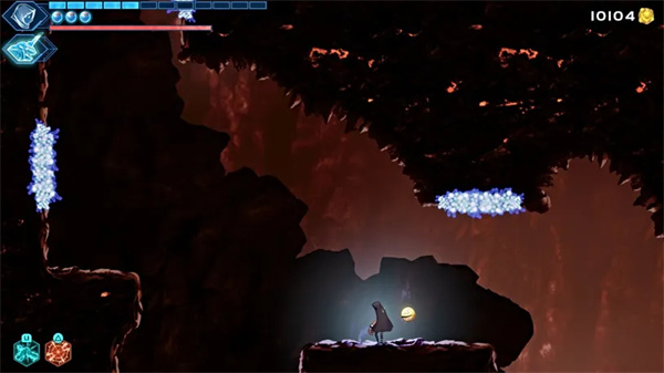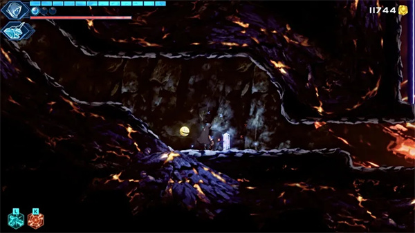 在下一个区域,您将来到一个广阔的熔岩室,您需要穿过它才能到达另一边的安全地点。为此,请使用上方天花板上的抓斗点和蓝色真菌点进行穿越,同时还可以利用你的空中冲刺和二段跳。