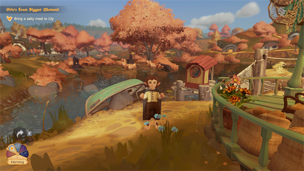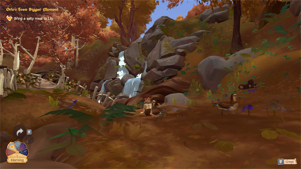 穿过白色的桥,与瀑布边缘附近的发光点互动。
