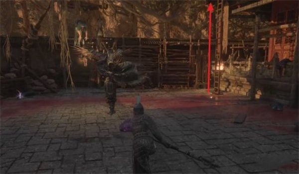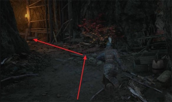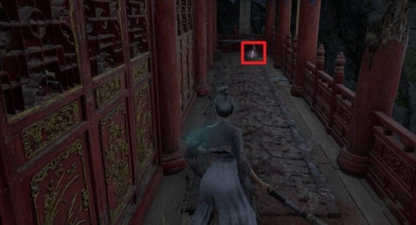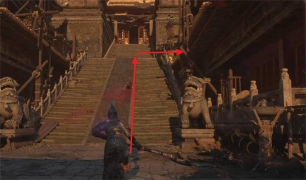 返回屋顶穿过木桥,经墙壁缺口直走至对面建筑楼梯处左拐。
