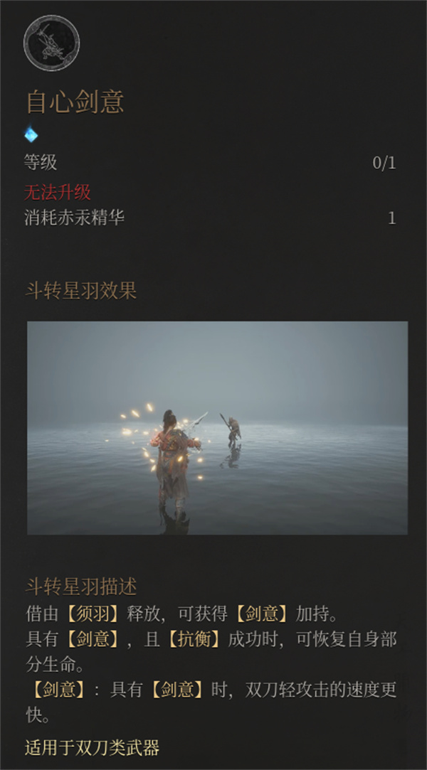 在配装上我们会再讲另一个要解锁的流派,则是自心剑意,可以让我们触发抗衡时可以回血,大幅度增加续战力,也不容易砍到一半突然暴毙。以上这些技能点完只需要20级,差不多就成型了。