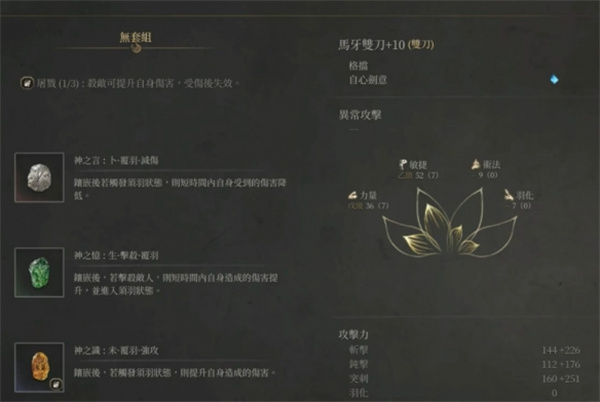 以上这三个词条配合起来,加上我们的双刀,只要成功抗衡,就会一直不断获得须羽,就能一直给我们自身上减伤与增伤的Buff,就可以让我们大杀四方。