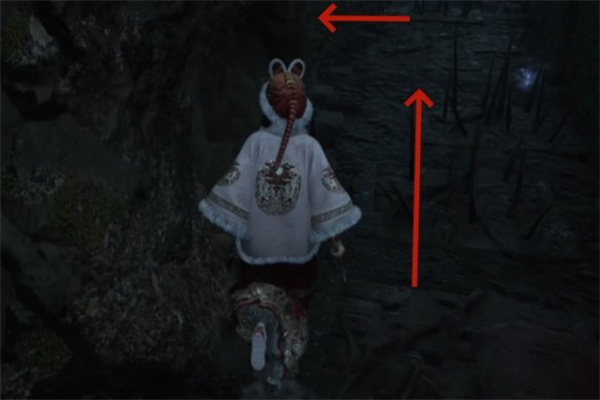 3、可以看到墙壁有个缺口,跳下去。往右转路过一个小平台,从右边斜坡向上。