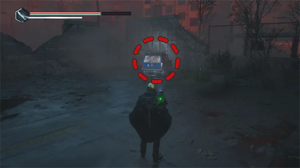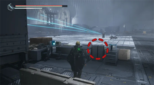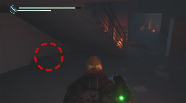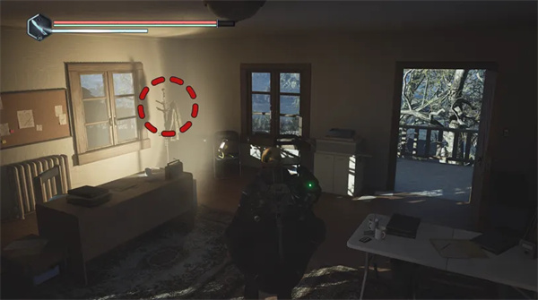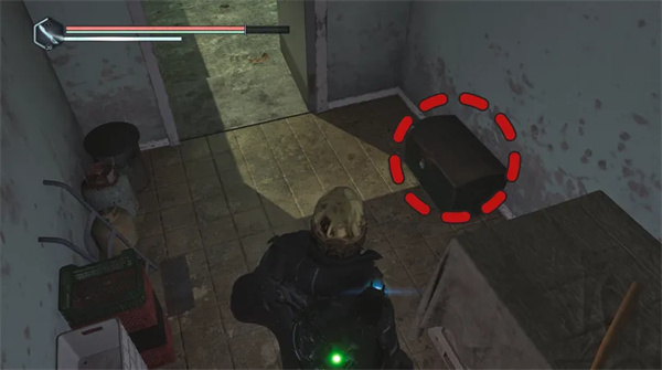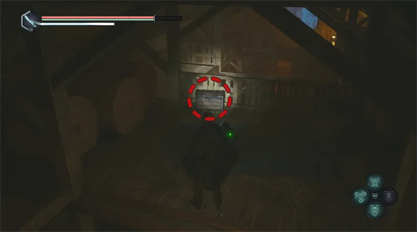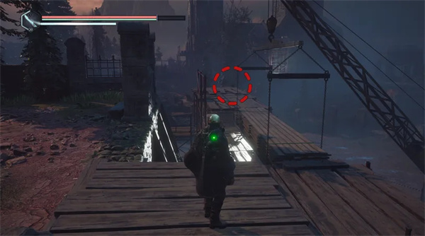 然后向右走(沿着矿车轨道)并小心地向右弯曲,上到一个凸起的木制平台上,平台上有一具带有帽子的尸体。