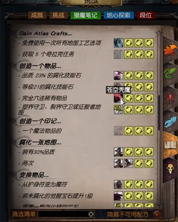 点击打开猎魔笔记,在这里有着配方,其中有着一个获得6连物品配方。