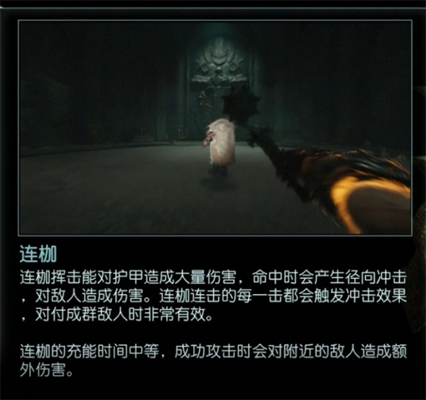 连枷挥击能对护甲造成大量伤害,命中时会产生径向冲击对敌人造成伤害。连枷连击的每一击都会触发冲击效果对付成群敌人时非常有效。