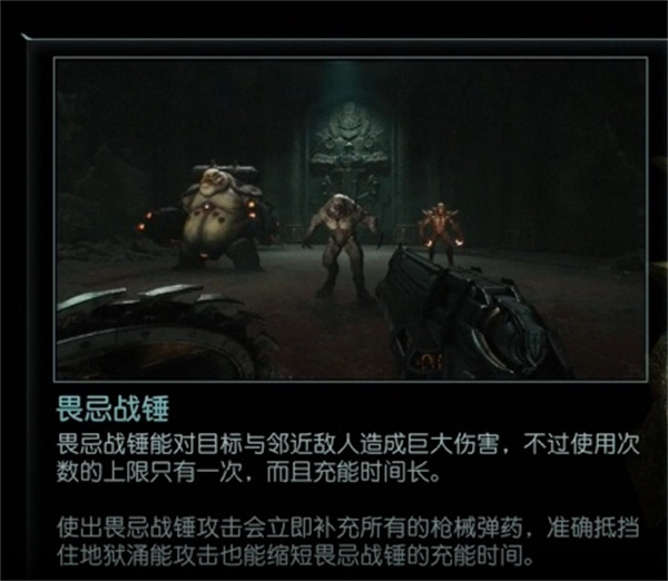 使出畏忌战锤攻击会立即补充所有的枪械弹药,准确抵挡住地狱涌能攻击也能缩短畏忌战锤的充能时间。
