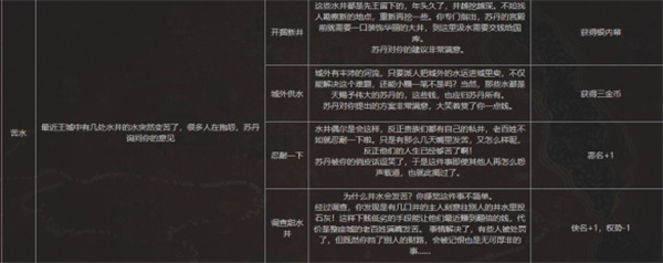 1、苏丹的游戏中有一个水井的事件“苦水”,这个事件有4个选项,分别是【开掘新井】、【城外供水】、【忍耐一下】、【调查甜水井】。