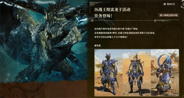 3、在猎人等级达到50级后,就可以参与到历战王煌雷龙的活动任务中进行狩猎。