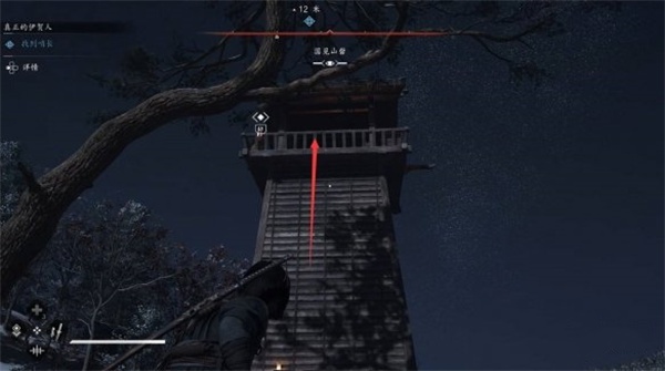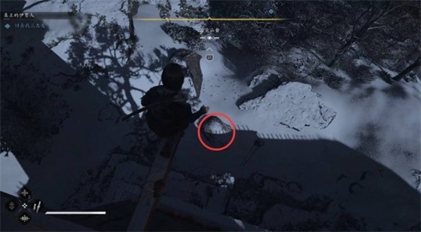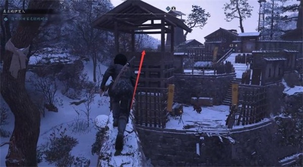 进入支线后,我们和NPC三太夫对话,接着爬上树枝,使用钩锁进入营地内。