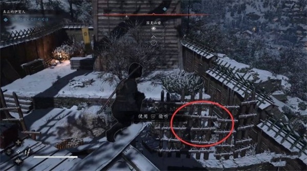使用钩锁进入营地后,我们爬到高处按L2键偷听“织田家足轻”的对话。
