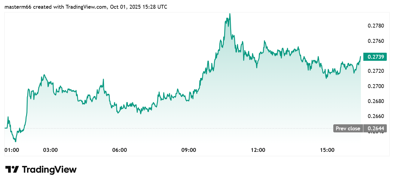 市场对此反应积极,Pi币价格24小时内上涨3.59%,最高触及0.279美元,本文撰稿时小幅回落至0.274美元。