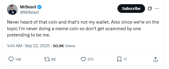 直到 2025 年 9 月份,随着 MrBeast 的钱包地址再次买进市场热门的 ASTER 代币,截至 10 月 1 日,MrBeast 共花费 168 万美元买了 95 万枚 ASTER。此举再次引发了社群关于他即将「喊单」的猜测。但这一次,MrBeast 的反应出乎所有人的意料。面对社群的讨论,他公开发表声明,直接否认了这笔投资,称他「从未听说过这个币」,并且「那不是他的钱包」。