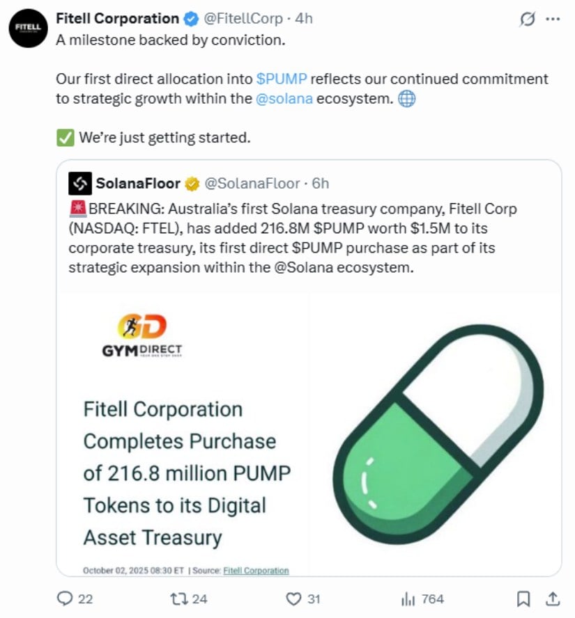 如今公司正大举进军数字资产领域。此次收购PUMP代币是其2025年9月底公布的Solana金库战略的延续——当时Fitell获得1亿美元融资,立志成为澳大利亚首家基于Solana的数字资产储备公司。