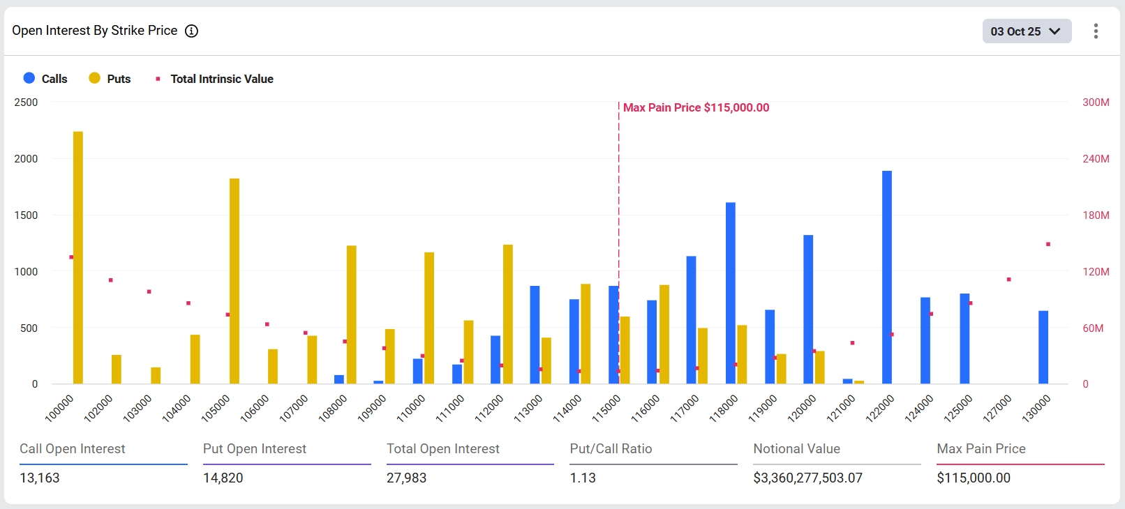 Deribit衍生品交易所将于10月3日到期28,000份BTC期权,名义价值达33.6亿美元。1.13的看跌/看涨比率表明看跌期权成交量高于看涨期权,暗示市场看空情绪。