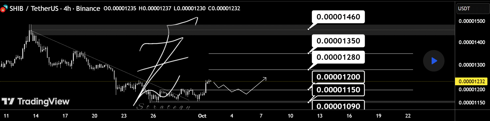 该分析师强调,柴犬币于9月28日突破下降阻力趋势线,当日最高触及0.00001203美元。此前自9月13日创下0.00001484美元高点后,SHIB 始终在该供给线下方运行,直至4小时级别实现突破。
