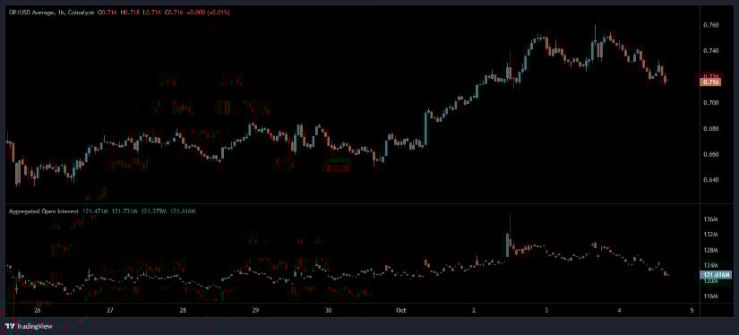 永续合约持仓量分析图表显示,Optimism价格过去数日在0.64至0.76美元区间震荡。缓步攀升后,代币在该区间上沿遇阻回落。最新小时线报0.716美元,表明早前上涨动能已进入冷却阶段。