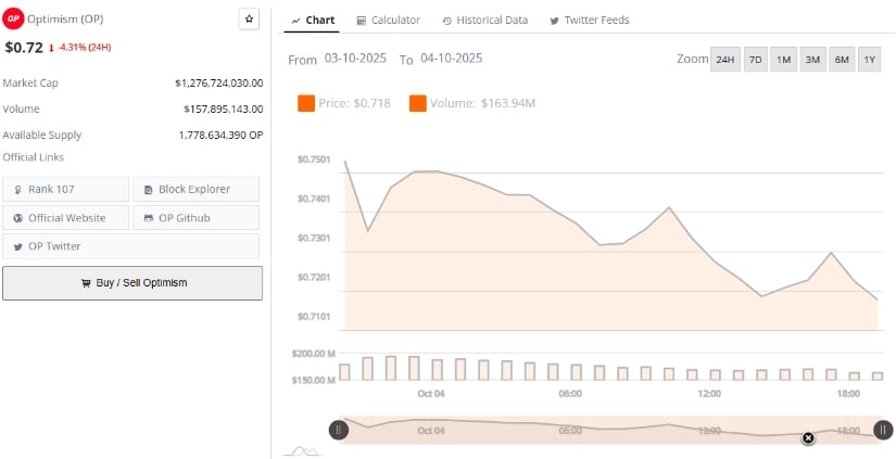 BraveNewCoin数据显示,Optimism现报0.72美元,24小时跌幅4.31%。其市值为12.7亿美元,日交易量1.579亿美元,流通供应量17.8亿枚。此番下跌使其成为当日Layer-2赛道中表现较弱标的,反映投资者情绪低迷。