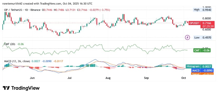截至撰稿时,OP/USDT交易价格为0.7162美元,日内跌幅3.8%。蔡金资金流量指标(CMF 20)读数为-0.06,显示温和卖压及资金净流出——表明卖方当前主导订单流。持续的CMF负值通常预示派发而非吸筹,往往伴随延长横盘或下行趋势。